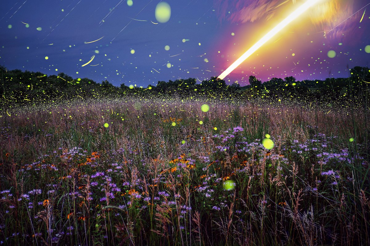 Beautiful full moon night sparking with fireflies above purple bergamot (bee balm) flowers. The bright line in the night sky is a long exposure "timelapse" of a rising moon composited of 5,496 shots over period of two hours during warm July night. Orange streaks on the top right are clouds in motion. The orange flowers are Coneflowers / Black-Eyed-Susans.