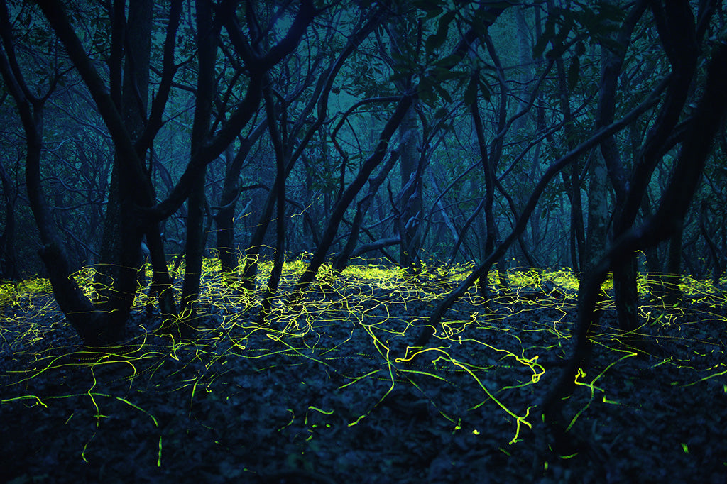 Photograph of Blue Ghost fireflies among rhododendrons on a misty rainy night in North Carolina.
