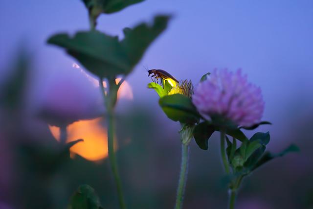 I took this photo of a firefly illuminating clovers during the full moon. The moon was still close to the horizon, creating the beautiful deep orange color. Single exposure.