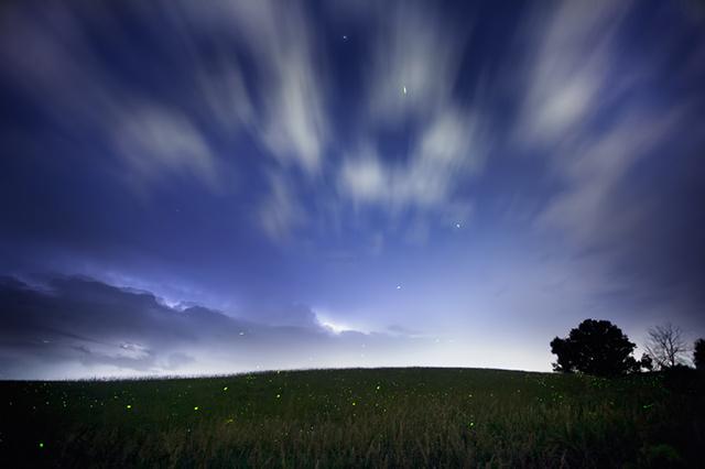 This was a single exposure. The illumination of clouds was caused by lightning. The clouds became elongated due to long exposure. One firefly launched itself to the space. Image ID: 72400
