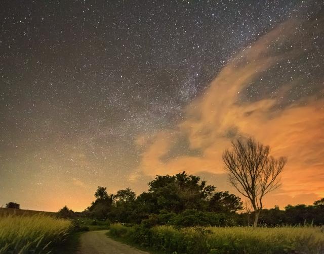 It was a starry night with a distant city glow. This is a combination of two photographs, one thirty second exposure for the stars and one longer one for the foreground. I took the photo in 2014. Image ID: 100807